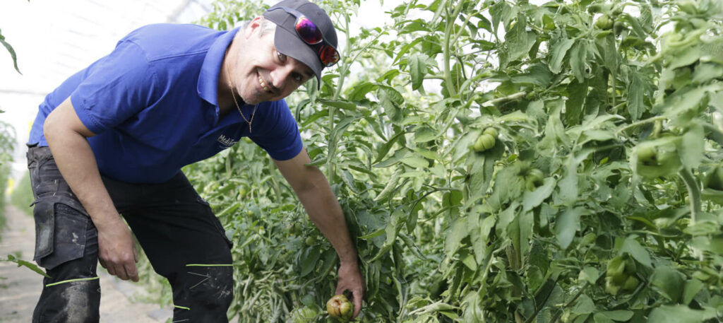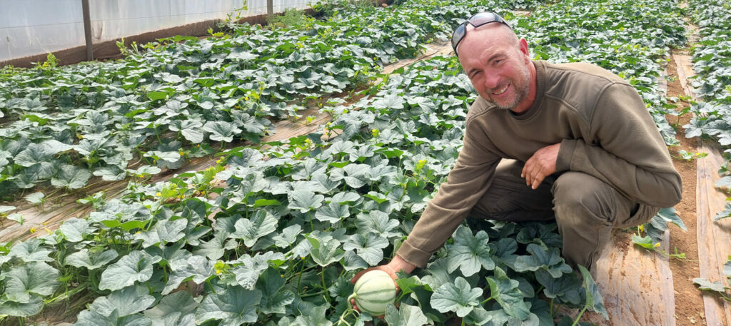 Il cultive aujourd’hui plusieurs variétés de tomates, des mini‑pastèques — son produit préféré ! — ainsi que des melons, des figues et des courgettes. À l’automne et en hiver, la production laisse place au chou brocoli, au chou de Bruxelles, au fenouil, aux laitues et au céleri branche.